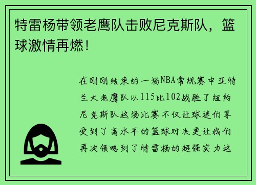 特雷杨带领老鹰队击败尼克斯队,篮球激情再燃!