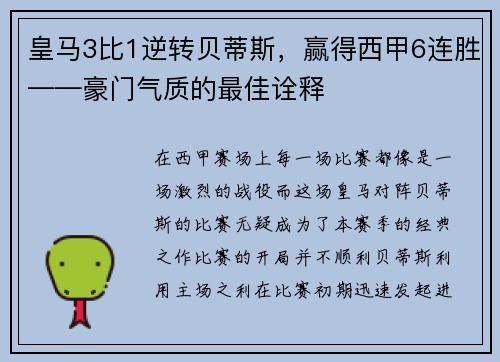 皇马3比1逆转贝蒂斯,赢得西甲6连胜——豪门气质的最佳诠释