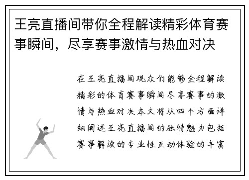 王亮直播间带你全程解读精彩体育赛事瞬间,尽享赛事激情与热血对决